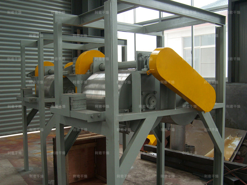 熱效率高。因滾筒干燥機傳熱機理屬熱傳導,傳熱方向在整個操作周期中保持一致,除蓋散熱和熱輻射損失外,其余熱量全部都用于筒料膜濕分的蒸發上,熱效率可達70%-80%。