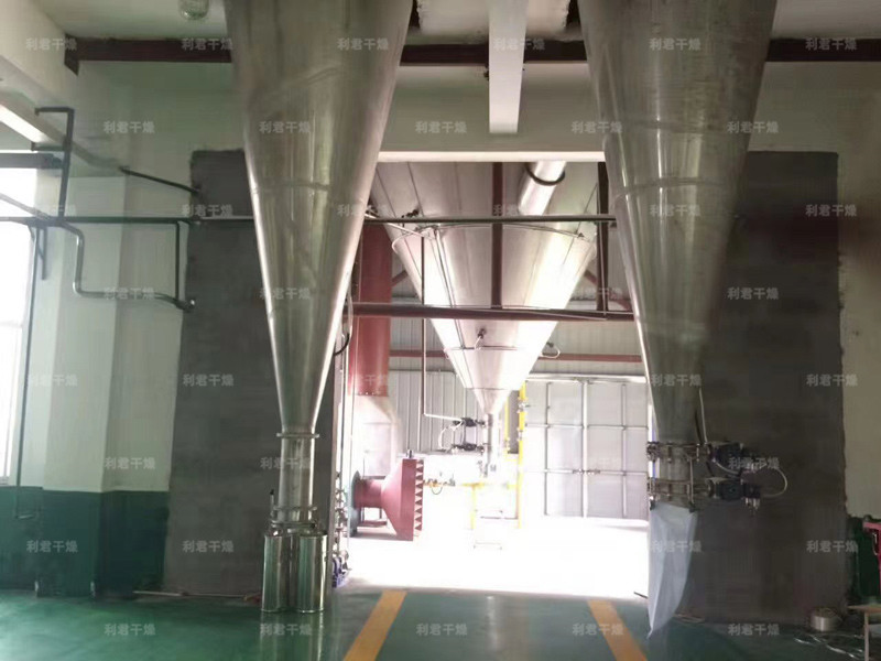 空氣經(jīng)過濾和加熱,進(jìn)入干燥器頂部空氣分配器,熱空氣呈螺旋狀均勻地進(jìn)入干燥室。料液經(jīng)塔體頂部的高速離心霧化器,(旋轉(zhuǎn))噴霧成極細(xì)微的霧狀液珠,與熱空氣并流接觸在極短的時(shí)間內(nèi)可干燥為成品。成品連續(xù)地由干燥塔底部和旋風(fēng)分離器中輸出,廢氣由風(fēng)機(jī)排空。
